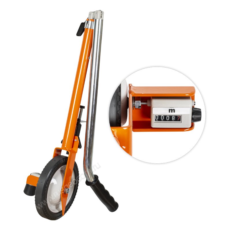 Курвиметр окрашен в яркий оранжевый цвет , чтобы выделяться на местности, а также имеет удобную накладку на рукояти для удержания в процессе работы.
